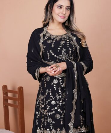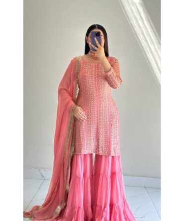 Pehnava Style Fox Georgette Coding Sequence Embriudery Work Kurtie Sharara And Duppatta