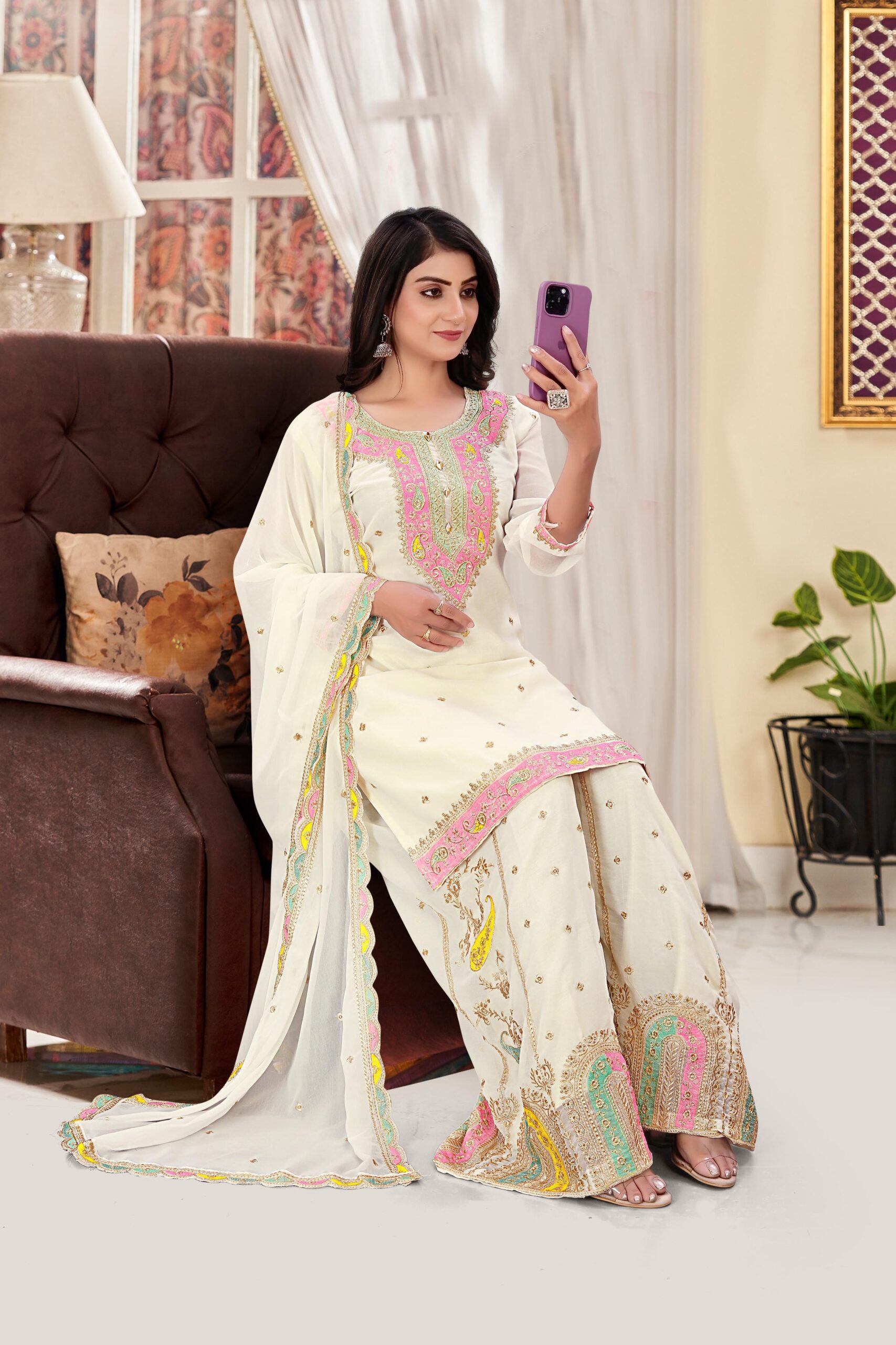 • Pehnava Style Heavy Chinon Silk With Embroidery Work Kurtie Palazzo And Duppatta