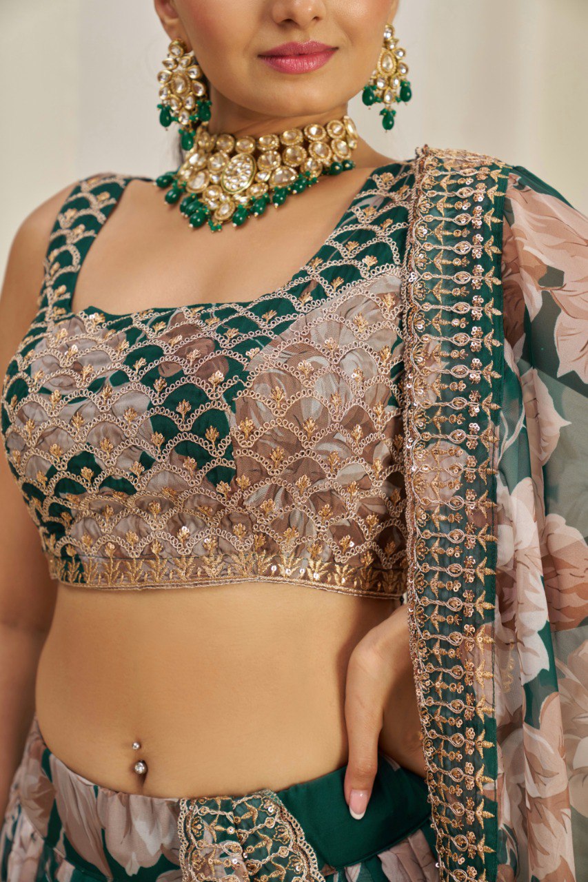 Lehenga Work : Floral Printed ,Zari, Dori, Sequins