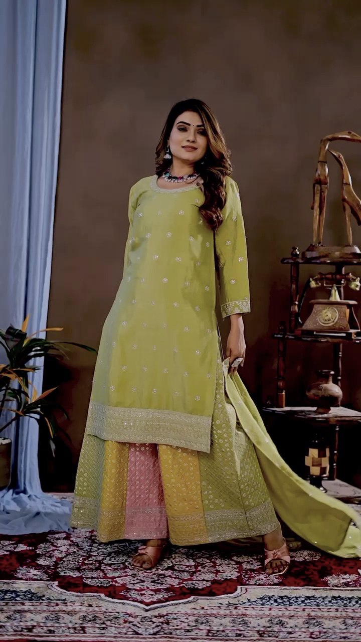 • ENHANCE THE BEAUTY OF YOUR WARDROBE KURTI PLAZZO SET WITH BEAUTIFUL ORGANZA SILK DUPATTA