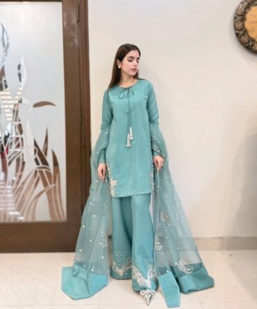 Be the first to review “Pehnava Style Pure Natural Crepe With Fancy Sleeves Kurta Farshi Palazzo & Dupatta” Cancel reply