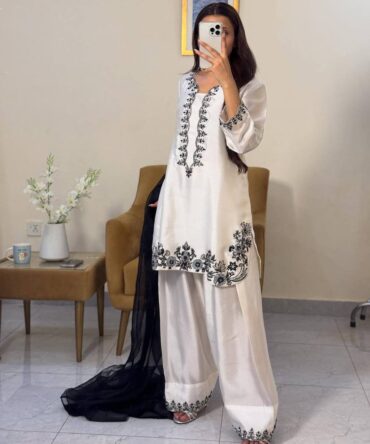 WHITE SEQUENCE EMBROIDERY ON SILK FABRIC TOP AND PLAZZO WITH DUPATTA